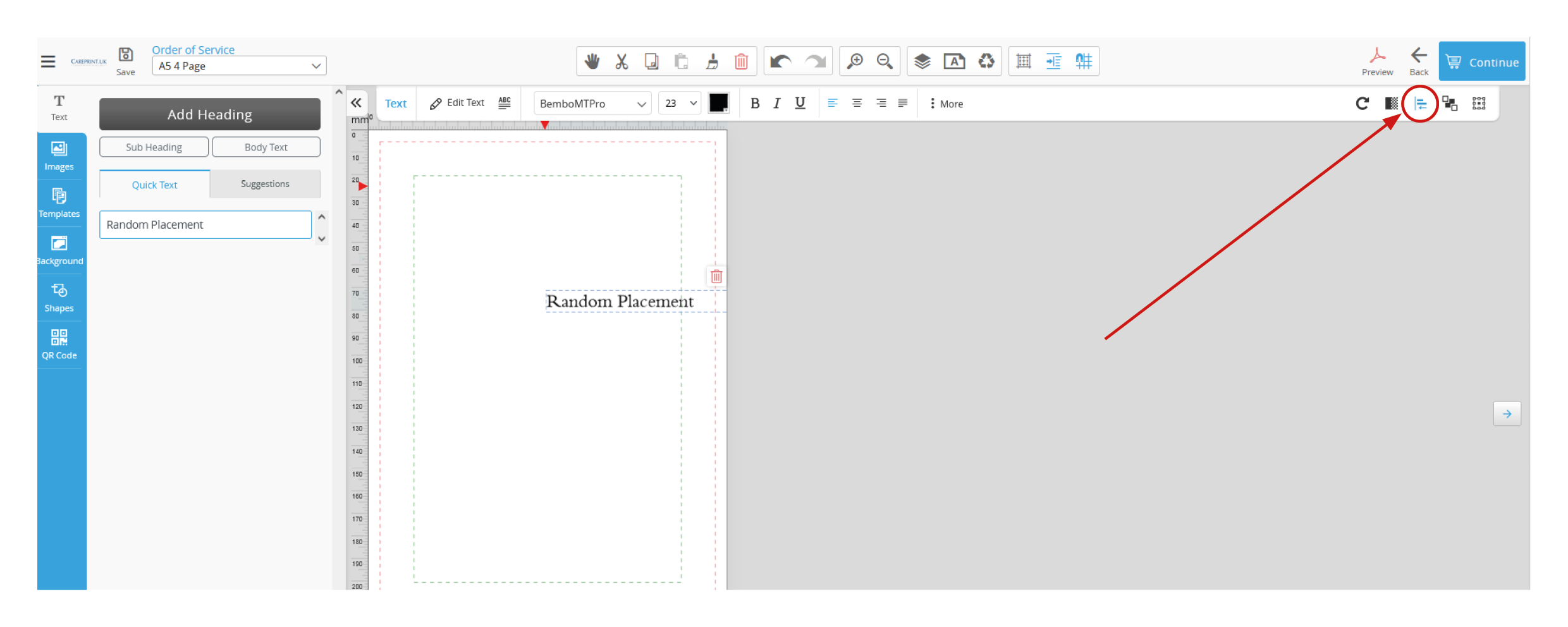 In the designer you will see a randomly placed piece of text and on the toolbar an icon for alignment.
