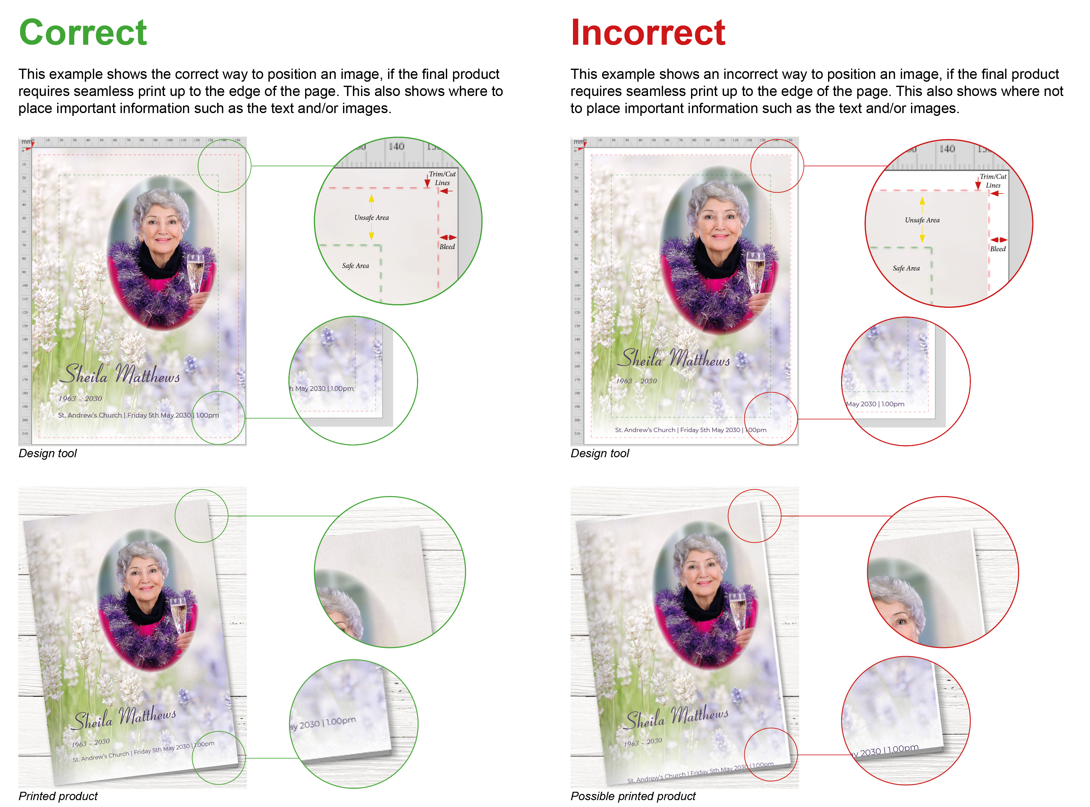 - The green line is the safe margin. Anything inside of this green box will not be trimmed off the final print. Anything between the red and green lines may be too close to the edge of the printed product and possibly get trimmed/cut off.